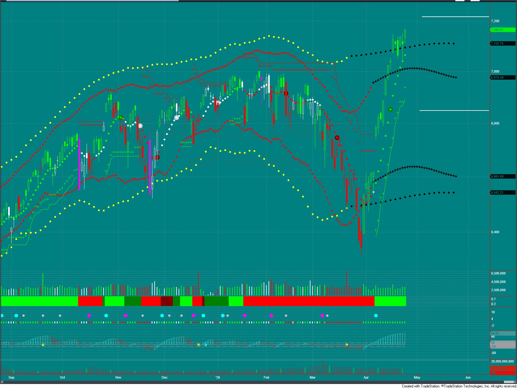 Monthly –Monthly bar recovers and is making new ATH’s. Trade pressures remain up, but declining. Volumes closed the month of March as bearish. The 7185 price remains the adjusted high. The next target up is 7258. A close below 6875 would signal a failure of the move up.